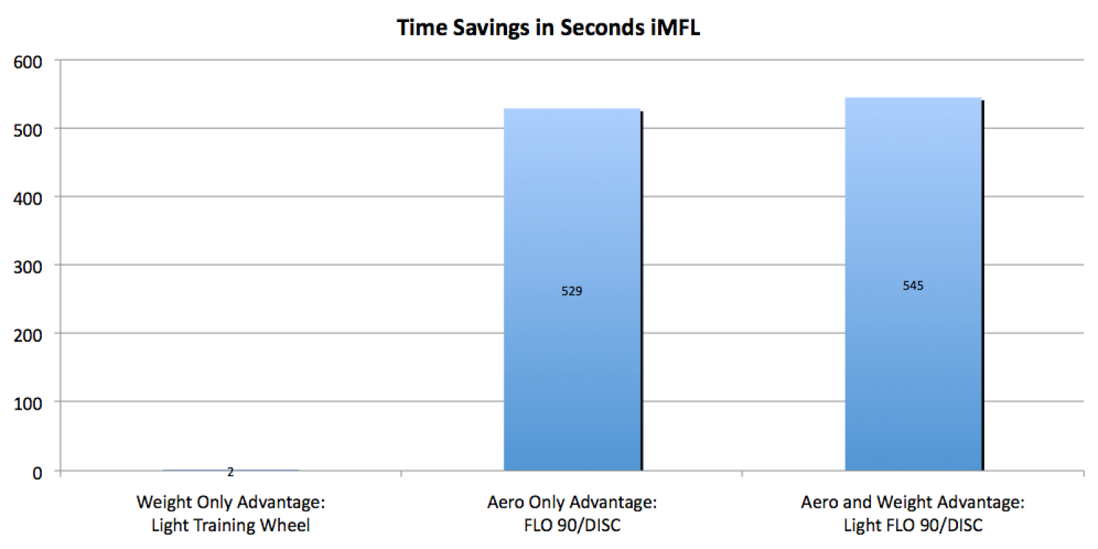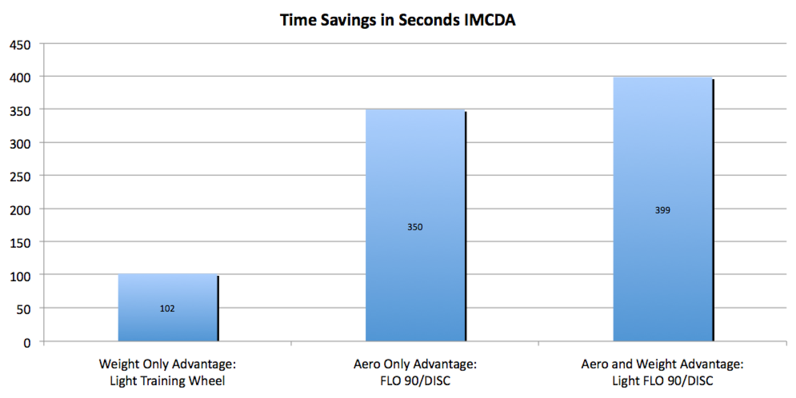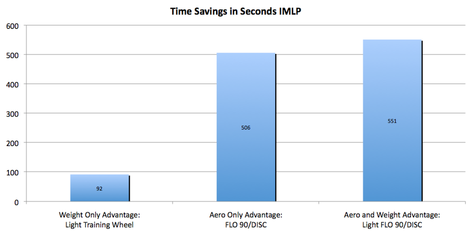 Disclaimer: The Light FLO 90/DISC listed below is purely hypothetical.  The Light FLO 90/DISC has the exact same aerodynamic properties of our standard FLO 90/DISC.  This means you cannot simply compare our FLO 90/DISC to any lighter deep front/disc wheelset and expect to get the same results listed below.  If the wheelset you are comparing is not as aerodynamic as our FLO 90/DISC, then the time savings will be decreased.  Please keep this in mind when reading the article and do not assume that deep and light equals the same results as the Light FLO 90/DISC.