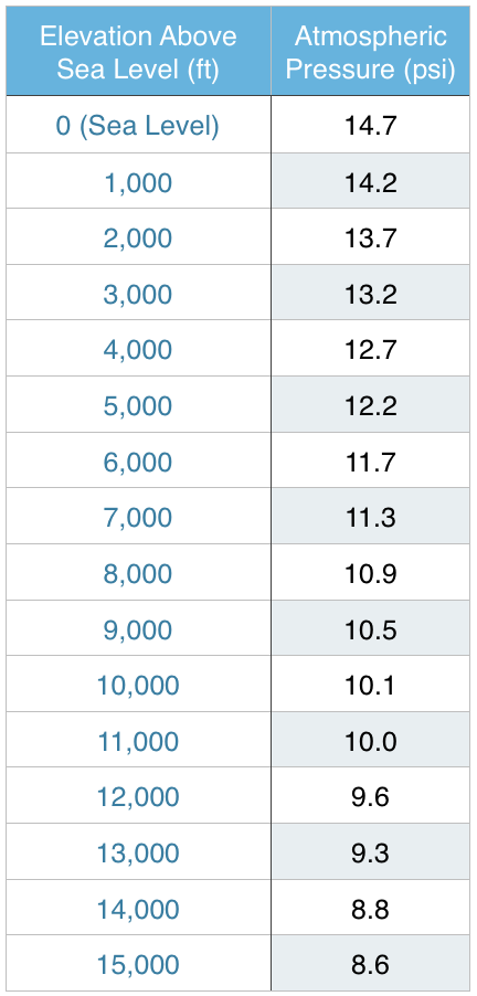 The easiest way for me to visualize what happens when we increase or decrease elevation is to assume we start at one elevation with 0 psi in gage pressure. Let’s say that we have a tube at 0 psi at sea level. The atmospheric pressure outside and inside the tube is 14.7 psi. Now let’s close the tube and head to a higher elevation. As we increase the elevation, the atmospheric pressure outside of the tube decreases but the pressure inside the tube stays at 14.7 psi. If the pressure outside of the tube is lower then the gage pressure would increase. Remember, gage pressure is the increase in pressure over atmospheric pressure.