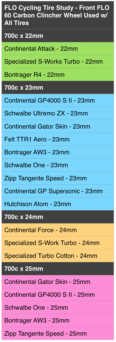 – All tires were tested on the same FLO 60 Carbon Clincher.
