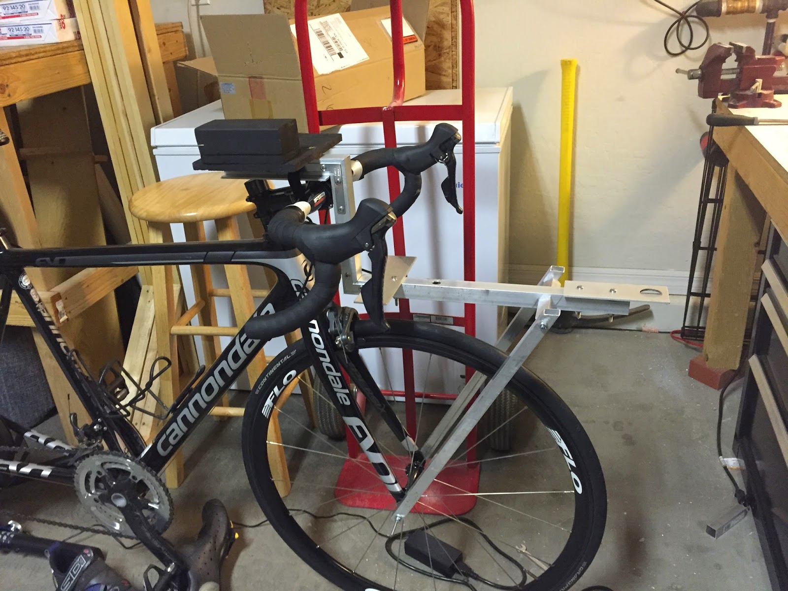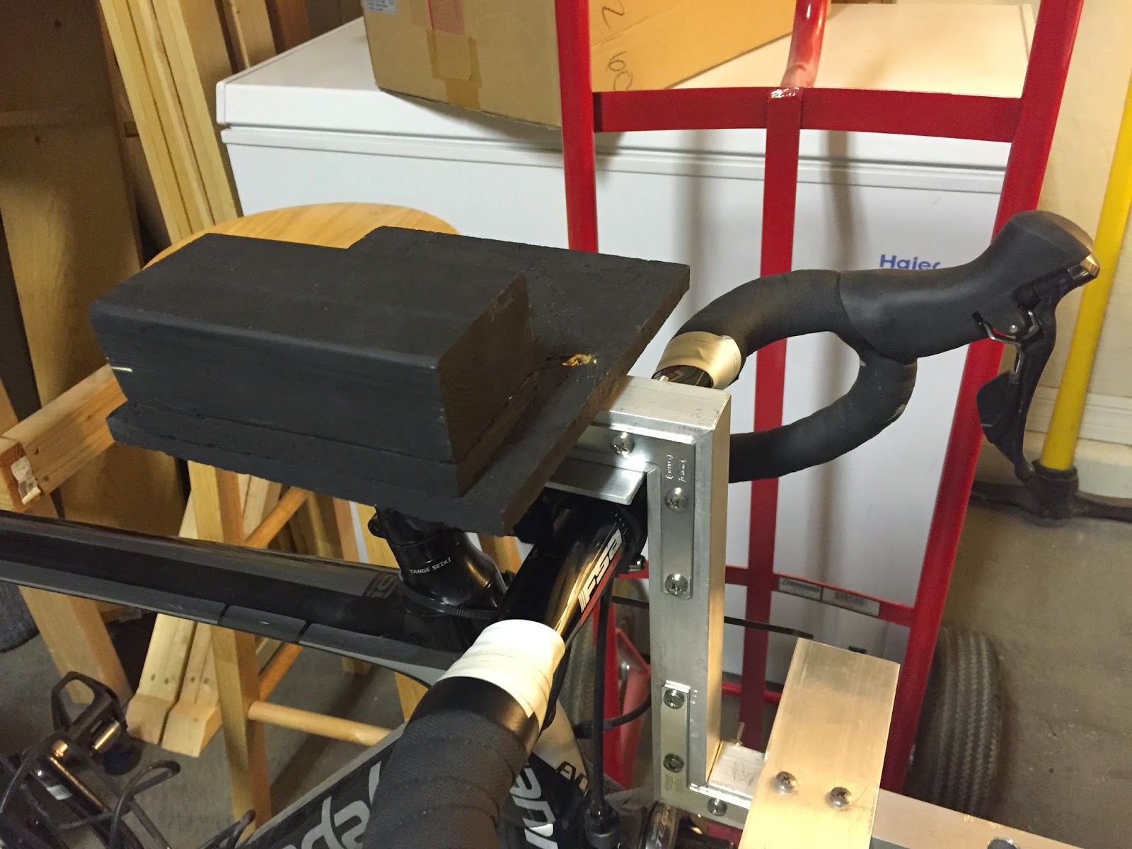 With the basic structure finished I had to create support legs that would mount to the front fork. The idea is that the mount will move with the front wheel since we are studying tires. Below you can see the support members that are holding the mount in place.