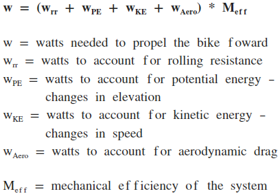 The above equation shows that the watts recorded from our power meter equal the watts of the entire system.  Moving forward, for simplicity, we are assuming mechanical efficiency is 100%.  If we break each watt component down further we get the following.