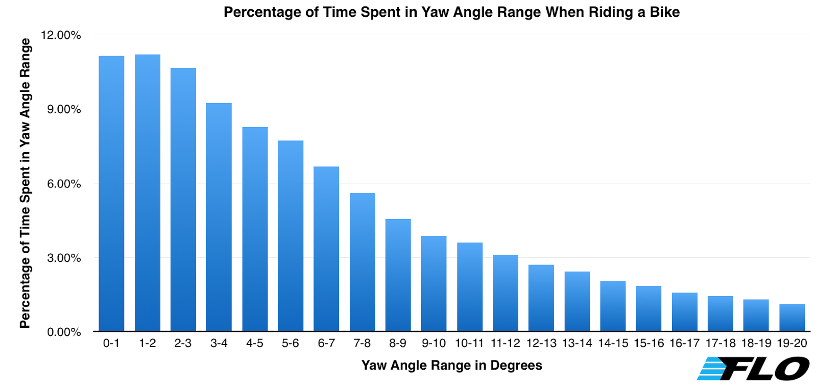 The graph and table below show the percentage of time a rider spends in a yaw angle range. For example, a rider spends 11.15 percent of their time between zero and one degree of yaw. Note: All negative yaw angle measurements are included in the ranges below.