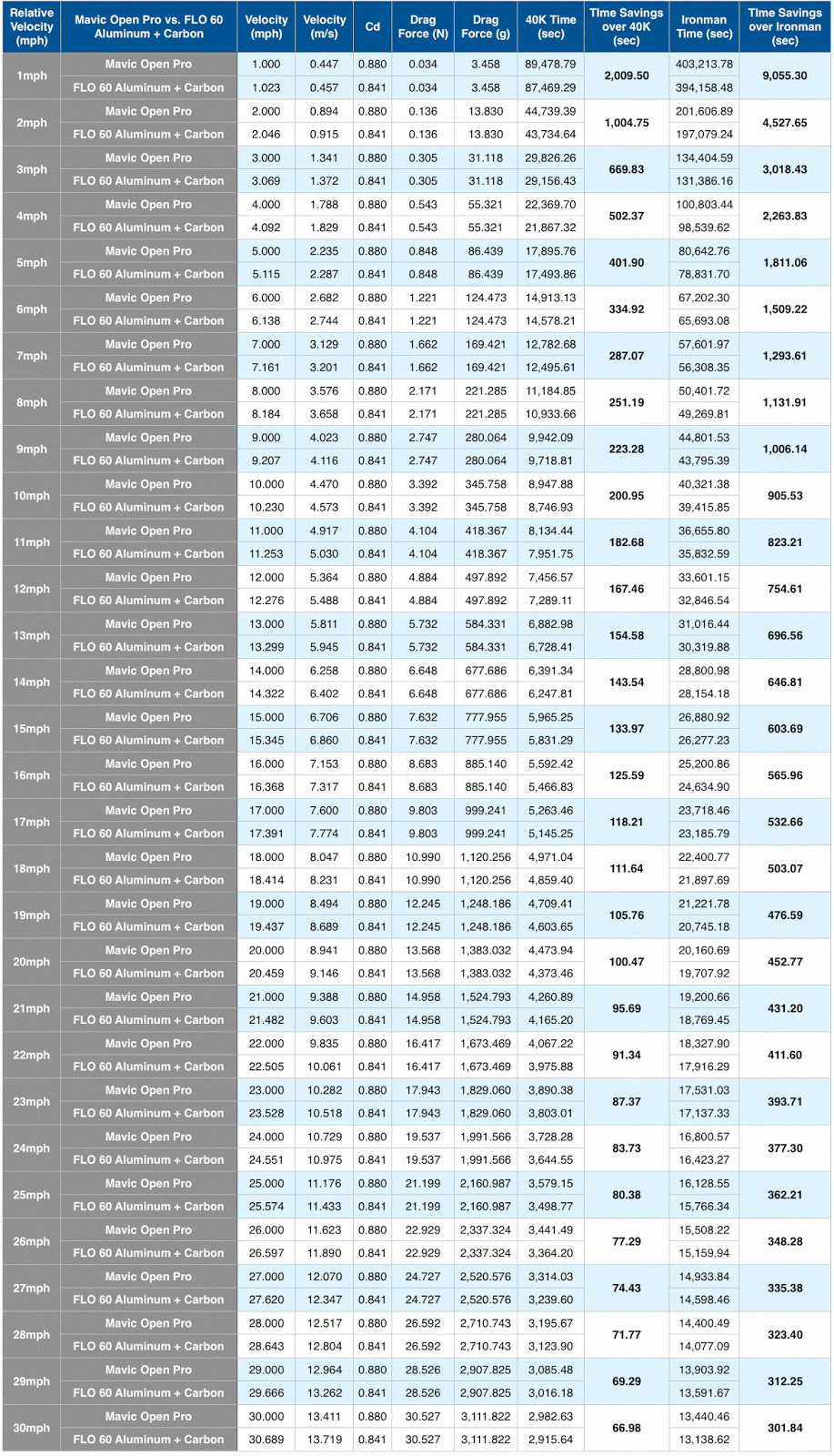 The benefit of aero race wheels is that they reduce your overall drag and make you faster. In 2012, I wrote a blog article that discussed how much time you’d save by reducing your drag while traveling at speeds between 1-30mph. In that article I discussed how there is a common misconception that you have to be traveling at a certain speed for race wheels to be of any benefit. The truth is, that is false. In reality, the slower you go, the more time you save over a distance. That’s right, if you were to ride 40km at 30mph you would save less time then if you were to ride 40km at 20mph. While counterintuitive, the best explanation I can give is riding at slower speeds allows you to experience the benefits of reduced drag for a longer period of time since it takes you longer to complete the course.
