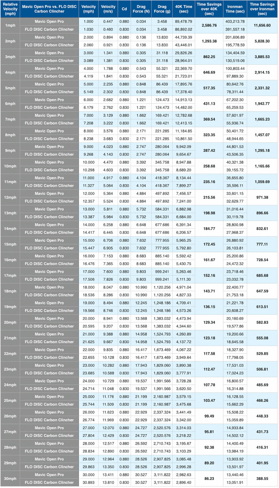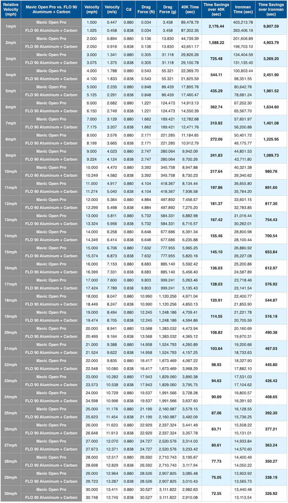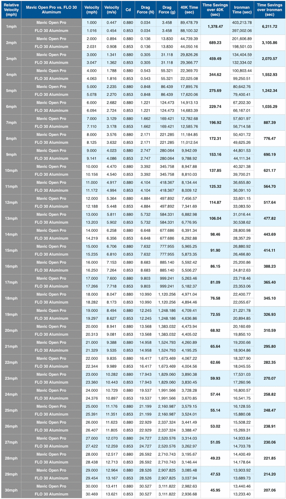 Since I wrote the first article, we’ve released all of our new wheels and have updated our Net Drag Reduction Value formula based on our Data Collection Project. Today, I wanted to share all of the new time savings charts for each of our new wheels for relative velocities between 1-30mph.